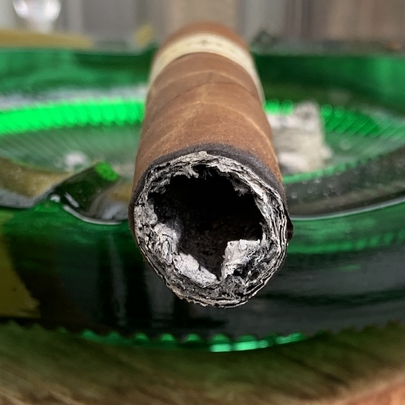 序盤の乾いた樫っぽさは丁寧に仕舞われるような貴重品なので、終盤でこそオスクーロらしさはあからさまになる。ここまで燃やし続けなければいけない。そのらしさというわかりやすい濛々とした黒味は、煙が幾度も通り染み付いた根本が燃える事に因るであろうもの、いわば煙に着火したようなもので、そうでもしなければ出てこない風味、先ず荒い。こうした現象はオスクーロではない場合にも起こる。もしこれがコロラドだったなら「コロラドらしさ」というはずだが、黒いほど「らしさ」は説得力を増す。あるいは「パルタガスらしさ」という有名な終盤のラッシュがあるが、この葉巻の終盤はそれと肩を並べる。こちらはやや暗いラッシュである。